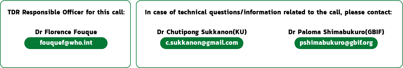 Under this call, about 10 participants will be selected for attendance to the TDR/GBIF training workshop, held from 24 to 25 November 2023 in Chiang Mai, and hosted as a side-event by the Asian-Pacific Conference on Mosquitoes and Vector Control, held in Chiang Mai from 27 to 30 November 2023.